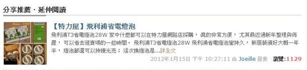 漲漲漲,漲聲響起,像兔麻這樣的小老百姓的心情卻很低落,油電雙漲之後,跟著大大小小什麼都漲,平常中午訂的便當單品馬上已經各漲十元,最可憐的是,只有薪水沒漲!在這樣無法開源的狀態下,像我這樣苦哈哈的受薪階層們,看來只好朝節流的方式來著手啦!電費要調漲,兔麻第一個念頭就是檢驗家裡頭的燈泡,下決心把它們換成「省電燈泡」好了,雖然短期要花費一筆換購燈泡的費用,但長期來看,應該還是值得投資的選擇!我向宇宙發下的訂單一定有被老天給聽到,就在這時候,竟然獲得特力屋的體驗金,馬上著手來挑選想要的省電燈泡摟!!寫到這邊,容兔麻先岔開提一下網路購物這件事,近兩年來,兔麻迷戀上網路購物的消費方式,因為實在是太方便啦!!不需要長途跋涉到賣場或百貨,也不需要逛的腳痠腿麻,更不用推著大大的購物車,接著大包小包的扛回家。網路購物商店裡,各種商品早就分門別類,想要哪類只要動動指頭點選標籤,不用在賣場中迷路,而想要知道哪種商品特價,往往還有促銷活動或限時搶購專區。而且商品下方還有分享推薦、延伸閱讀專區,看看其他網友的心得,也會更了解產品的狀況與特色,真是幫助龜毛的兔麻做決定的好幫手啊!若是想比價或更了解商品資訊,馬上請出估狗大神,一下就搞定。這次搜尋省電燈泡,我來到特力屋的網路商店,兔麻以前就是特力屋實體商店的愛好者,現在有網路商店更是方便啦!看,很清楚的分類標籤。 搜尋了一陣,看到這款【飛利浦T3省電燈泡28W-黃光】。28W,大小卻只高15X寬6X深6公分,體積很輕巧,而亮度竟然與白熾燈泡 125W 相同,且標榜平均壽命長,更亮更省電! 馬上來看看下面的分享推薦。 看起來蠻不錯的,決定,就是它了!由於是要放在客廳,兔外婆喜歡黃光,她覺得黃光比較柔和,也更有居家的溫馨感受,所以我選擇了黃光。同款商品還有白光可選唷!星期五晚上快十二點才下單,雖然網站上說要五到七個工作天才到貨,結果,星期日我就收到包裹啦!真是超迅速,給個讚!打開包裹,鏘鏘,新鮮的四粒燈泡,因為是易碎品,外頭還用塑膠泡泡袋包覆。 一盒兩個燈泡,我買了兩盒。 盒子的側邊,有能源效率標示。這顆燈泡屬於第二級。另一側有詳細說明,省電80%,且壽命高達3000小時,約為白熾燈泡的三倍呢! 打開包裝的模樣。 準備要裝啦,幫燈泡特寫一下。 馬上準備將它換在家裡的走廊上。 哇!好棒喔!又明亮又溫馨呢! 再放在這次一起購買的弗能金屬立燈當中,真是超有感覺啊! (關於弗能金屬立燈,因為兔麻還有很多話想說,所以看倌們可以看另一篇文章的全文唷^^)http://vernier.pixnet.net/blog/post/37356054想要更新家裡的燈泡嗎?心動不如馬上行動,不妨一起來手指血拼吧~~特力屋網路商店網址:http://www.i-house.com.tw/現在全館消費滿2000元就免運費喔!!(兔麻隨便買就破兩千了,而且還有好多待買清單喔,掩面~)購買時也可填寫兔麻的share+推薦代碼:vernier(感恩唷~)