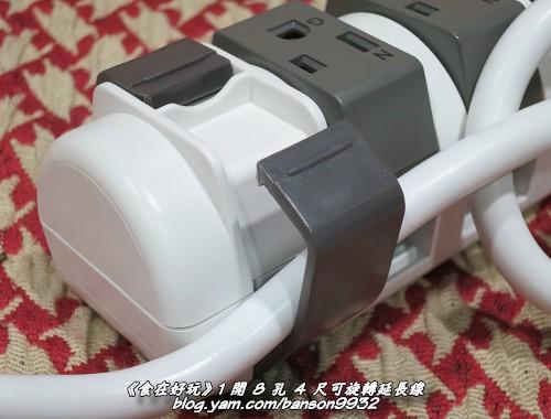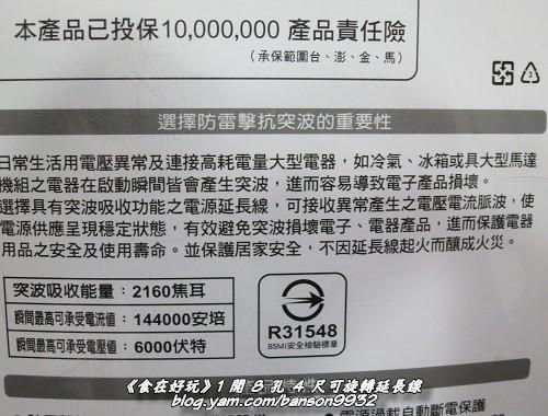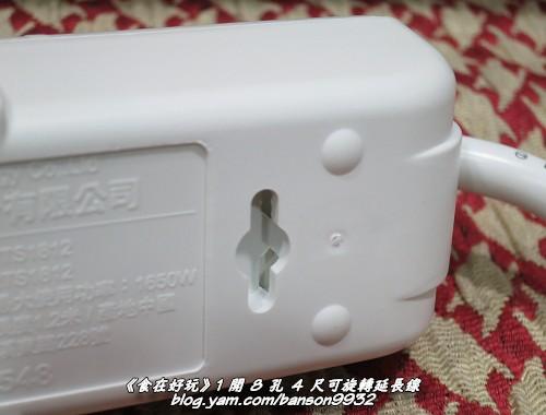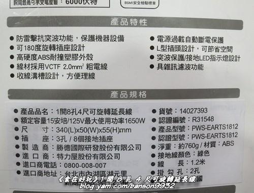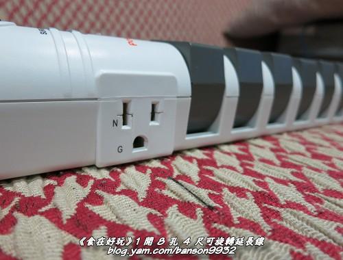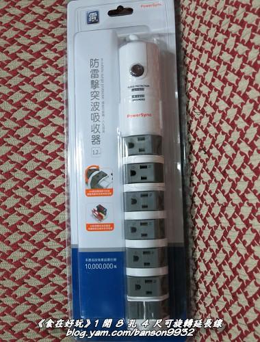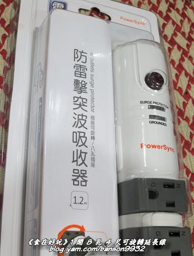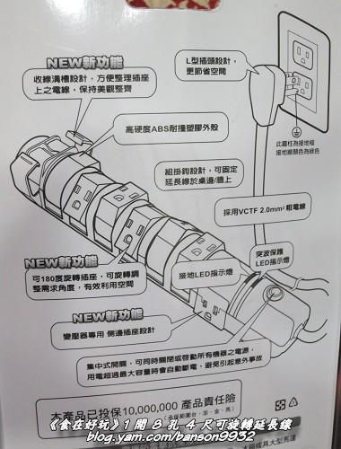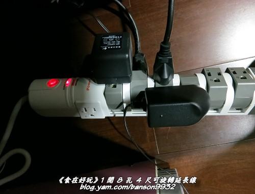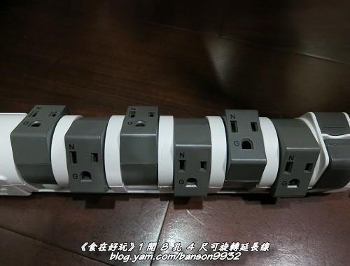 每個人家裡的電子商品愈來愈多,所需要插電、充電的需求也愈來愈高,家裡的插座好像永遠也趕不上電器產品的增加,所以每個人家裡都會有延長線。延長線用久了,每個人所特別需要的種類也不盡相同,所以市面上延長線的種類也是琳瑯滿目,這次要來介紹的是「1 開 8 孔 4 尺可旋轉延長線」,沒錯!我們要的就是「可旋轉」,哪裡買?特力屋網路店買來的喔!這組「1 開 8 孔 4 尺可旋轉延長線」的長度是1.2m。沒錯!!是八孔,不過仔細看下圖數一下,只有六孔呢!剩下的兩孔"揪竟"在哪裡呢、別急,是分別在兩側各有一個的變壓器專用,側邊插座設計看一下使用說明吧!另外這個產品的特色是「防雷擊抗突波」,可保護插座後面所連接的各項電器,當發生雷擊或電壓突然發生異常時,此延長線就會吸收突波、穩壓,進而達成保護電器、延長電器壽命的效果。再來看一下產品特性與規格:收線溝槽設計,方便整理插座上之電線2組掛勾設計(各在兩端), 可固定於桌邊或牆上180度選轉插座,可調整需求角度L型插頭,可節省空間尤其有些電器的變壓器的體積比較大,所佔空間也大,有些插頭的設計方向也不盡相同,有些延長線沒有旋轉功能,可能往往就會被佔了兩~三個插座的空間,非常不方便。像上圖這樣,每一個插座都可以旋轉,不會彼此影響到,也不會浪費掉插座的空間,甚好~甚好呀~哈哈哈~~什麼~~家裡還沒有可旋轉的延長線?也快來敗一組吧!*********************************************************更多我在Sharer+分享的文章http://www.sharer.com.tw/search_list.aspx?unit=1&memberid=835我的布拉葛http://blog.yam.com/banson9932歡迎光臨指教!購買時推薦帳號記得填寫"banson"喔,謝謝!感恩合十~