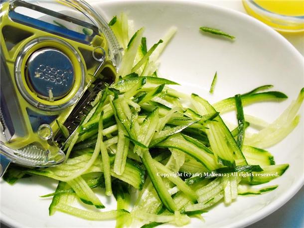 第三種最讚的就是刨絲,很難用刀切漂亮的小黃瓜絲,這隻刨刀輕輕鬆鬆就削好囉!