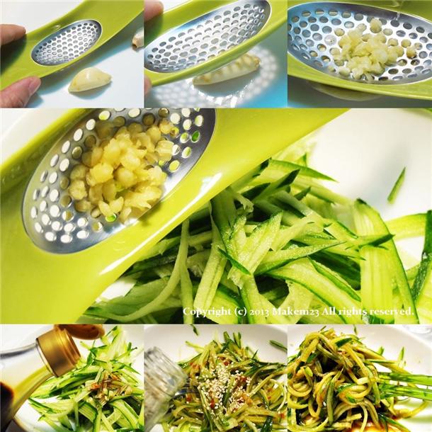 再來看媽肯用組合包裡面付的三用刨刀和壓蒜泥器做了快速的{小黃瓜沙拉}。