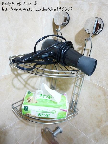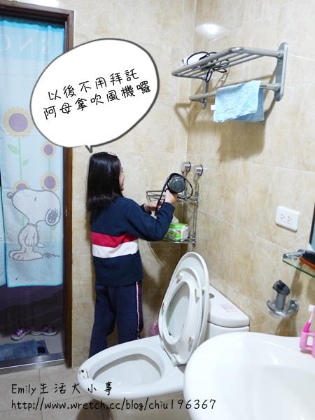 小朋友終於可以自己拿吹風機吹頭髮了,不然老是要我和老公幫忙拿吹風機,雖然說拿一下又不會怎麼樣,啊可是每次都要拿,偶會煩的啦!這置物架找很久,因為不想在牆壁上釘釘子,但又要耐重,終於找到這可以耐重14公斤的置物架~一次買二組,在特力屋網路店上買的,名稱好長喔!超荷重吸盤雙層雙扇型活動置物架~免鑽孔免工作,輕輕鬆鬆就可以DIY完成的置物架,愛用國貨,台灣製造~這組置物架還標榜用環保電鍍,還有歐盟環保規範標章~使用前,衛生紙還是放在沖水桶上面,那個吹風機放得好高好高呀!小朋友根本拿到咩!又不准小孩踩著馬桶上去拿,就要很常常麻煩老爸老木拿下來~累人喔!一下子置物架就裝好了,完成了,小女子就可以自己搞定,不需要靠男人幫忙~家中成員小妞妞的身高最矮了,現在小妞妞可以很輕鬆自己拿到吹風機了,也可以自己收和放吹風機了,小孩子,就是要訓練他們自己用完東西後,要自己收,大人也輕鬆,一舉二得!這種吸盤之前買過,因為覺得好用,所以這次又加碼買了這組扇型置物架~我很喜歡這組置物架的設計,因為是扇型的設計,所以可以運用牆角處來增加空間,使用起來也不會撞到或卡卡的~菱,以後別再找籍口說放不到上面了,吹風機用完後,記得要自己收好放好,這樣才是乖小孩喔!如果你也是HOLA和特力屋的忠實買家,記得把你買的好物分享給大家,大家一起來賺回饋金吧!GO~GO~GO~我的推薦代碼:emily196367謝謝!!《sharer分享+》http://www.sharer.com.tw《HOLA》http://www.hola.com.tw《特力屋》http://www.i-house.com.tw