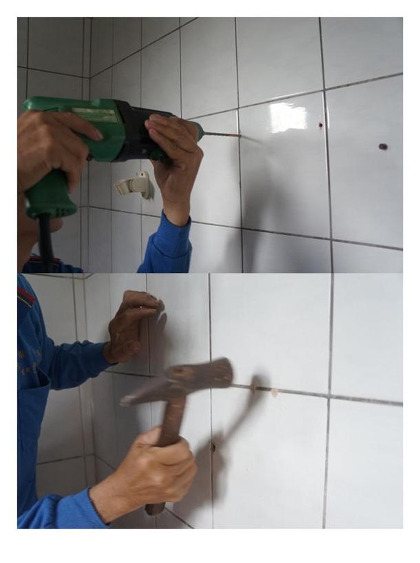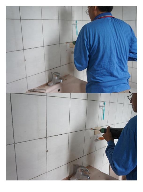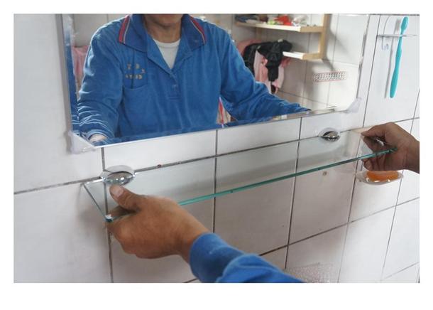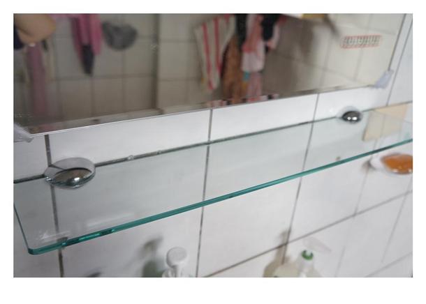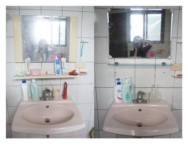 浴室裡的這組鏡子+置物檯實在是用很久了溜~然後那個置物檯因為承受不了重量居然右傾了...對!!我絕對沒拍歪~它是真的右傾了啦!!鐵釘也有點脫落溜~然後我先是用比較高的沐浴乳瓶子撐著不過想想這樣不是長久之計去年在特力屋購物的點數累積了不少~所以趁著3月底點數到期之前,把點數折抵掉~火速下手了這個正在特價的「普羅浴用方型明鏡附平台」價格很實惠,,,造型也很簡潔!!!本來想說把舊的拿掉就可以直接掛上去~結果這款「普羅浴用方型明鏡」後面要掛的洞跟這舊的不同~舊的比較偏外面~「普羅浴用方型明鏡」背後可以掛的洞比較偏中間所以洞得重新鑽囉!!香菇媽一開始還想可不可以不要鑽洞,去買掛勾之類的~但香菇爸極力反對~ 一來是鏡子背後的洞太小只容的下鐵釘~二來鏡子還是要讓它穩穩的掛在牆壁上比較安全畢竟掛勾隨時都有掉下來的可能吶~~東鑽西鑽終於鑽好溜~~而放平台的架子也需要兩個洞所以重鑽!!!鑽好後把平台放上去再鎖緊就行啦~然後我默默的發現香菇爸把平台鎖太高了....因為香菇媽不准再重新鑽洞..所以只好就這樣囉!!!新舊比一比~果然還是新的好~~哈哈哈哈~~