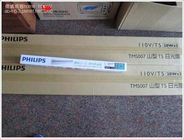 趁著特力屋有200元優惠活動,買了3組T5燈具,準備將10多年前的浴室、老人家房間、我的廚房燈具,通通換成T5,因為這些地方的燈光明顯不夠,為了安全性、看書報看電視舒適性,還是換成更省電更光亮的T5。包括飛利浦全電壓家用支架燈14W-晝光色、飛利浦T5山型燈具(28W)-雙燈管。【飛利浦Adreno T5全電壓電子式家用型日光燈】採用專利輻翼反射板設計,反射面積加寬10%。使用T5燈管,比T8燈管省電20%。使用電子式安定器,立即點亮不閃爍。超纖細輕量化設計,體積小一半。低光衰,使用10,000小時仍保有80%亮度。 瓦數:14W色溫:晝光色(白光)6500K適用電壓:110~220V產地:台灣適用商場、房間、浴室等各種場合。PC不導電材質燈體高頻電子式安定器立即點亮現代感遮光罩外型設計安裝簡單維護容易 ,全電壓使用最方便台灣製造品質有保障零件-卡榫、螺絲有開關設計,因為體積小,像是外出露營聚會就是非常好用的照明燈。快速插接設計,一插即亮還可串接,最多可串接10支。 趁老公放假,捉來做白工.......現在一進到浴室,都會不自覺說~好亮~好亮喔,沒錯,雖然價位較一般燈具多了2-3倍,但卻更省電更光亮,浴室是危險地方,如果太暗容易造成跌倒傷害,尤其家中有小孩、老人家者,也建議換更明亮的燈具。接下來就是我的廚房~每天做菜的重鎮地,光線當然不可以暗~~~這款【飛利浦T5山型燈具】,較一般T8燈管省電且發光效率較 T8 燈具高;此外,使用電子式安定器,可以使燈具隨點隨亮且可以避免電流經過線圈所產生的耗損,較一般傳統式燈具更省電。雖然我看不懂,但還是附上管線圖。這款比T8還輕。工作~工作~工作,家中有人會做水電,真的省很多,否則一般水電工的工錢還不便宜呢。一樓因為挑高,如果燈管不夠亮,就會影響生活舒適性,過不了半小時,終於換新了,真的亮很多,這樣做菜就方便多了。另一組當然就是老人家的房間,這樣看書報、看電視就舒服了。PS 【飛利浦T5山型燈具】不含燈管,請另購。------------------------------------------↓↓↓結帳時填上分享帳號【 frank022 】再按下分享賺唷^^-----------------------------------------------本文同分享於部落格 http://ab463.pixnet.net/blog 如有任何問題請指教^^↓↓↓想知道產品更詳細資料~往下點吧!!