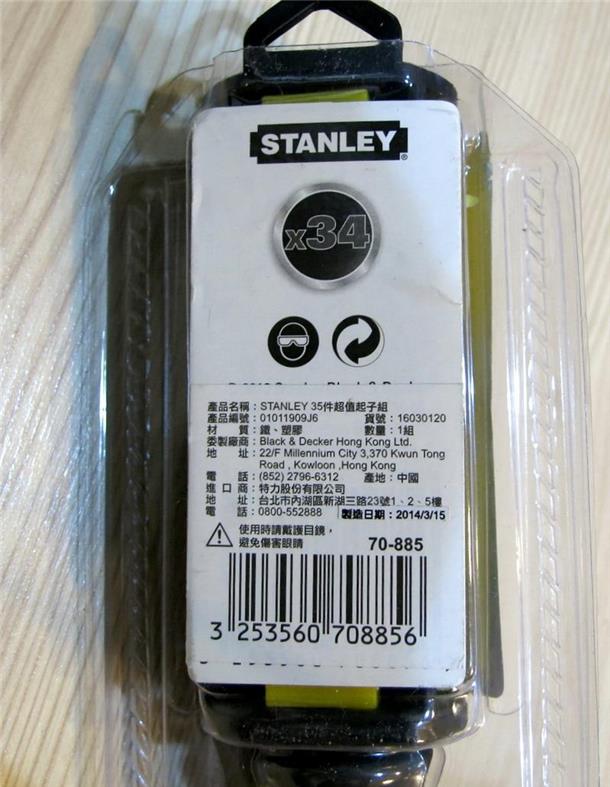 小蝌蚪家中大約有三、四支螺絲起子,但時常找不到適用的規格錯誤的規格不好鎖就算了,有時候還把螺絲釘弄壞,搞得更難收尾於是小蝌蚪爸爸一直想要All in One的一套螺絲起子組但多數特殊規格的螺絲起子使用率不是很高,整組買下來很不划算剛好特力屋正在特價這一款:STANLEY 35件超值起子組70-885小蝌蚪爸爸毫不猶豫,直接買了Stanley是美國老牌的工具廠商像是現在每位師傅必備鐵捲尺,就是這家公司所發明的它所生產的工具樣式非常多,而且許多設計都別具巧思,有獨家擁有許多專利這次購買的35合1起子組體積非常小(34個頭+1支手把=35)常用的規格通通在裡面一字:3-3.5-4.5-5-5.5-6-7mm十字:No.0-No.1x2-No.2x2-No.3星形:T5-6-7-8-10-15-20-25-27-30-40六角:1.5-2-2.5-3-4-5-6-7-8mm三排螺絲頭可以翻轉起來,上面圖示也非常清楚,增加使用的便利性起子頭卡在架子內非常牢固,要稍微用一點力才能拔出來(太容易拔反而容易掉出來)而且起子頭上面也都有編號,方便辨識、歸位手把頂端的套筒採用常見的1/4"規格,裡面有強力磁鐵輕輕將起子頭放進去,會聽到「喀」一聲,黏得緊緊的,不會用到一半掉下來不用的時後就可以將手把插回起子頭固定座起子頭固定座內部中央也有一個鐵塊,可以讓手把吸住起子頭固定座上面還有一個掛環,這樣就可以整組掛起來而且手把還不會掉下來喔手把的大小適中,再加上有黑色的橡膠部分,用起來順手不滑手,而且1/4"規格的起子頭也適用於所有快拆的電動工具只是卡不住又沒強力磁鐵,使用上要小心一點這麼多起子頭,最令小蝌蚪家滿意的就是「六角7號」(不是海角七號)因為家裡有很多M牌送的玩具,裡面都有附電池但為了不讓小朋友亂拆發生意外,所以都是特殊規格的內三角螺絲釘因為無法拆開取出電池,導致小蝌蚪家不敢將這些玩具直接丟垃圾桶,回收也沒人要有了這個起子組後,就可以安心地拆開玩具,換電池、回收電池************************************************同場加映UltraPower複合扳手這次選購三支15mm、11mm與9mm其中最急用的應該就是15mm,可以拿來換腳踏車的踏板這是特力屋的品牌,台灣製造,材質為烙釩鋼硬度佳,操作更是方便,不浪費多餘的力氣,輕鬆省力的拆裝一端為開口、另一端為梅花(旋轉時可保護螺姆,更能延長的壽命)符合德國DIN標準SUNK PANELMATT FINISH能安心使用重點是:便宜好用啊!