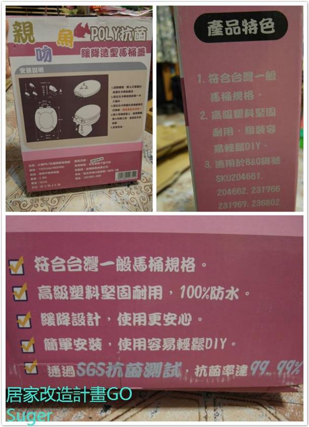 我家的舊馬桶蓋,從小用到大吧!有著n年的歷史這次收到特力屋邀稿~http://www.i-house.com.tw/可以選購馬桶掀蓋馬上上網找,找了很久選了這款~有抗菌又有緩降的馬桶蓋!!親吻魚POLY抗菌緩降馬桶蓋網路下單超簡單`下單的隔天就到貨了!!速度好快阿~白天要上班的我,平常都是請一樓理髮店阿姨幫我代收貨,才有上次那種窘境要自己扛上五樓真的是很痛苦下單的隔天傍晚收到司機的電話司機 : 張小姐~你現在還在一樓嗎?可收貨嗎?我聽了超高興~馬上回說:我在家!不好意思可以麻煩您幫我搬上五樓嗎??謝謝你司機~好整個開心到不行~哈哈哈不用在那扛得要命,痠痛好幾天但也害了司機把貨車停在樓下,被唸被叭,我真是不好意思死了結果= =這一箱好小一箱........我自己可以扛上五樓的 哈哈哈大失策~算了!沒差 特力屋的配送司機人好好喔!!! 馬桶蓋的外紙盒,有圖解如何安裝 商品編號:016002275商品尺寸:長49,寬37,高5(公分)商品特色 : 具抗菌、緩降功能POLY 材質造型活潑可愛為浴室增添不同色彩材質:POLY 還有通過SGS抗菌測試,抗菌率達99.99%!!! 打開包裝,裡面有用保麗龍保護馬桶蓋彩色的魚~馬桶掀蓋,好可愛喔 裡面附上簡單的工具&配件 開始來拆解,一開始舊的要拆掉我跟我阿母研究好久我阿母去問了,我姊的公公馬上就解決了然後開始來組裝這組新的摟!!! 這款真的組裝很簡單喔!!仔細看外紙盒的圖解,我們母女研究了很久其實很簡單,他還附一個轉頭,抓到訣竅後,馬上就組裝好了!!組裝完的成品我整個很有成就感 哈哈哈沒想到,我也可以組裝馬桶蓋了 終於組裝好了!!!!!!!放個簡單的比較圖就得因為使用了N年啊!~黑色都有些斑白了新的一裝上去整個就不一樣了~ 怕有礙觀瞻,我有用馬賽克跟星星遮一下!哈哈哈整個廁所變得好繽紛沒想到換了馬桶蓋可以變那麼多!!!大開心 現在使用起來,最棒的是[緩降]之前要是要放下馬桶蓋一定是 碰的一聲要是半夜要上個廁所,馬桶蓋要放下,碰一聲 我家球球就會開始~汪汪叫現在有了緩降的功能,不會吵到球兒 自己也不會被碰一聲嚇到 哈哈 球兒昨天我帶他去剃毛~留一顆頭他回家後,心情好像不是很好變得一職撒嬌,黏著我跟阿母 以上是我的居家改造介紹相關文章可上Suger部落格 http://suger25.pixnet.net/blog 順便推薦大家一個很棒的平台~Sharer 裡面有好多人推薦的好物喔!!文章超多!!還可以直接點選商品,超方便的-->邀請您將您【改造之心得】,或【好物的使用】,分享於Blog與分享+平台分享+平台:www.sharer.com.tw/這平台還可以賺回饋金呢!!只要到HOLA or B&Q特力屋網路平台購買商品,不是紅利集點,還是讓你賺現金回饋呢~分享+鼓勵您樂於分享,只要您將喜愛的商品或使用過的感受分享成圖文給網友們,當網友購買成交後,您就可以獲得該商品的推薦 回饋獎金。不論是在Blog或個人/公司的網站也能放置貼紙,讓您添加額外的收入。分享+就是透過簡單的推薦及分享的方式,來讓您賺取回饋獎金。 在結帳的時候,填入自己的推薦代號就OK!如果您不想申請,也可以填入我的代號喔^___^ -->suger25