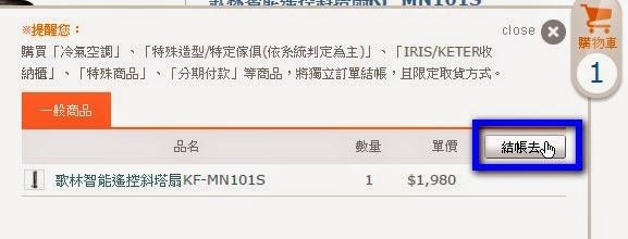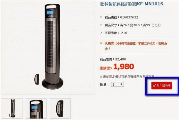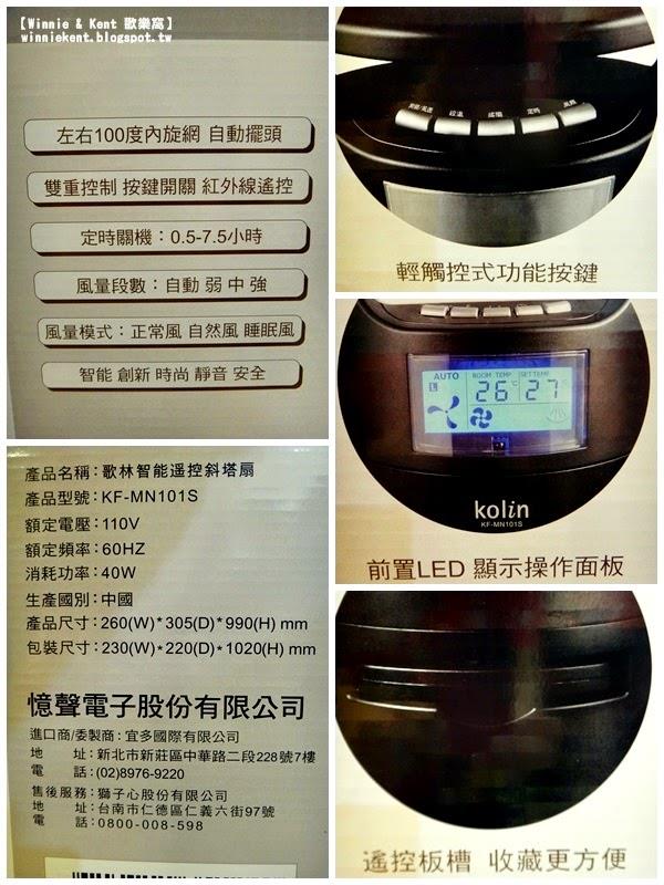 【前言】三月底四月初的時節,收起了厚被子後天氣依舊不太穩定,Winnie 跟 Kent 的房間因為沒有對外窗,加上室內螢幕、電器又很多,悶熱的感覺似乎比大家來的早了一點。兒童節+清明連假前夕,在特力屋網站選購【收納用品】時,逛著逛著竟讓我又找到一個好物 ~【歌林智能遙控斜塔扇KF-MN101S 】這款直立式電扇,網路上價格約2,490~3,060不等,特力屋網站優惠 ~ 1,980因為符合Winnie的需求,利用【網上訂購,到店取貨】的方式就連同【收納用品】,通通一起打包回家啦!http://winniekent.blogspot.com/2015/04/Storage.html========================================================================【網上訂購,到店取貨】因為先前在這篇介紹過特力屋到店折扣,也正好因為近期有【網站下單,門市取貨滿額送】http://www.i-house.com.tw/bulletin/detail/id/214這次連同其他商品,到店取貨的訂購流程大概是這樣的:Step1:在特力屋網站中,將需要的商品【歌林智能遙控斜塔扇】【加入購物車】http://www.i-house.com.tw/product/detail/id/515286Step2:按下【結帳】Step3:將畫面拉到最下方選擇【門市取貨】 (這裡要注意,會員手機號碼填寫正確喔)Step4:接下來就是取貨門市的選擇~Step5:輸入信用卡號,之後會收到訂單完成E-mail (也可以自己在訂單查詢中確認)4/1訂購,隔天下午Winnie就收到取貨通知的簡訊了4/3這天,趁著回娘家前夕,再度來了一趟特力屋士林店停好車,直接到門市服務櫃台,將簡訊Show給服務人員看後,服務人員會將商品連同推車一起送過來,確認簽收後就可以開心離開了。(p.s.另一箱是Winnie購買的收納用品,箱子很大但其實裡面不多啦 XD)因為當天有停車,問我服務人員,他給了我們一張限時免費停車的證明拿著停車卡到停車服務櫃檯消磁就可以囉!========================================================================【歌林智能遙控斜塔扇KF-MN101S】這次購買的【歌林智能遙控斜塔扇KF-MN101S 】在網站上的簡易規格說明是這樣的:商品尺寸:長26,寬30.5,高99(公分)商品規格/材質型號:KF-MN101S定時關機:0.5 至 7.5小時風量段數:自動、弱、中、強風量模式:正常風、自然風、睡眠風斜塔設計三段仰角手動調整:0度/6度/12度產地:中國外箱的高度,大約在Winnie胸前的位置上頭簡易的標出了電扇的規格、介紹打開外箱後,電扇被完整的包覆著除了電扇本體外,另外還有底座、說明書+保證書先將兩塊半圓形底座組裝起來後因為與電扇本體要用螺絲鎖住,這時就是Kent出動的時候啦取下原本的四個螺絲,將拼好的底座對準,鎖上~除了可以直接在正面LED面板上使用【按鍵開關】外直立電扇的背面,收納著【紅外線遙控器】裝上兩顆4號電池,就可以使用兩種方式操控電扇第一次使用這種直立式電扇,感覺還真的蠻新奇的先從簡單的部分開始介紹~這台【歌林智能遙控斜塔扇】顧名思義可進行三段角度調整,0度、6度、12度,可以自由調高風向 (仔細看~ 電扇向後傾斜,風向變高了)在按鍵 & 遙控器上,可調整風速大小:(開機) → 自動Auto→ 弱 L→ 中 M → 強 H → (關機) (機身按鍵【開關/風速】是一起的,遙控器則分成兩個按鈕)風類模式則分為正常風、自然風、睡眠風三種【自動擺頭】,可進行 左右100度內旋網自動擺頭,(出風口縫隙很小,小朋友不太容易誤觸,相對安全許多)另外可以選擇是否要【0.5~7.5小時定時設定】最後一個是所謂 【設溫】的功能因為LED面板上會顯示目前室內溫度,電扇可以調整所謂【希望溫度】每按一次設溫按鍵,設定溫度會增加1度 據說是在啟動自動風速Auto時,會針對室溫v.s.設溫進行比對,調整風速大小========================================================================【使用心得】趁著連假,實際了操作使用了幾天Winnie個人認為這是一台物超所值的好物~安全環保設計外,也兼具了外型時尚好看的效果,不佔空間、方便收納擺放,女生單手搬動也是毫無問題另外就是超方便的紅外線遙控器,趟在床上操控電扇完全懶惰 XD電扇本身提供的風向、風類、強度及其他功能都非常實用透過自動風速、定時及設溫,多功能的提供不同的需求真的不得不套用早期Nokio的名言~ 【科技始終來自於人性】短短幾年時間,連傳統電扇都能有如此大的進步與改變平價好物,值得推薦給大家使用。