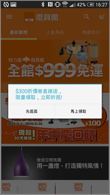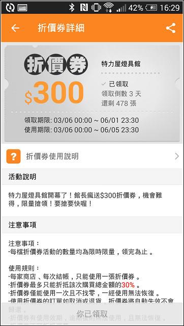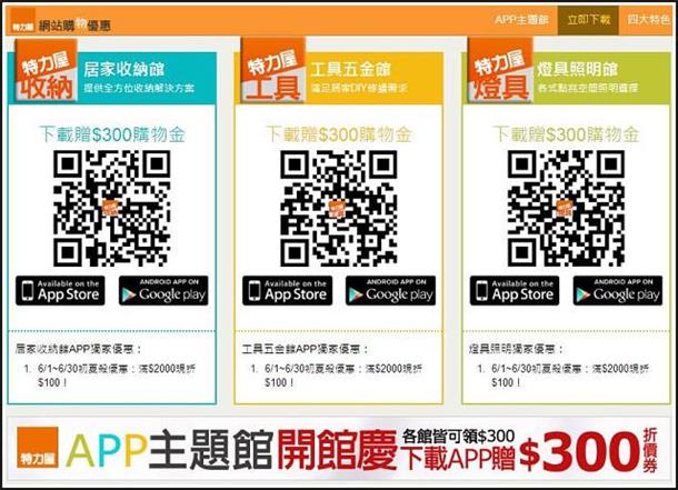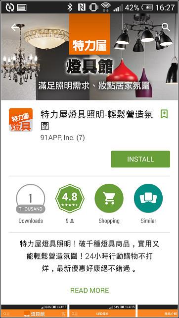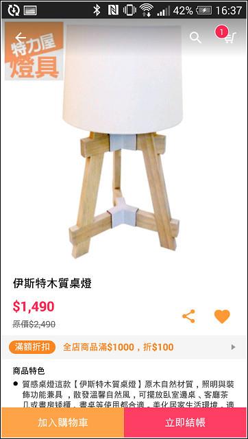 以往購買特力屋的家電用品、工具或燈具等商品,都得跑一趟門市採購但隨著網路的發達,開始有了『特力屋購物網』,只需在電腦前動動手指頭,就能解決不論是居家用品、園藝、收納、家電、淨水器,甚至要買燈泡、找燈具都不是問題現在更進化了,人手一機的時代,加上行動購物的概念只需下載APP,突破時間空間的限制,立馬就能敗家了(喂~),是更方便採買家用品不定時還有折價券、APP優惠、購物金等好康,不下載實在對不起自己啊家中的客廳是小貓很常待的空間,回到家後幾乎都窩在這裡打轉前陣子想說讓客廳來一點休閒渡假風,所以添入了一張"伊諾克仿藤單人吊籃"果真成為居家中超有人氣的王牌座椅,大小朋友都愛不釋手連朋友來訪也紛紛對這張吊籃椅深感興趣,大家都搶著霸佔著臥躺在這彷彿就像置身在他鄉,有的放鬆心情、遠離塵囂的輕鬆無重力感不過,目前客廳除了主吊燈與洗牆燈之外,似乎少了一盞檯燈有時在這邊看看書、寫寫文章、想想事情,開了整間的燈光似乎有些浪費如果想要上『特力屋購物網』買居家用品,又不想開電腦的時候該怎麼辦!?像小貓這時候想要買燈泡、找燈具,其實只要拿出手機,並且下載特力屋APP就可以解決接下來不論你是在大眾交通工具上坐車、或是躺在床上、甚至是在上廁所時可以盡情的享受購物的樂趣,慢慢逛慢慢看,數千種商品任君挑選安裝特力屋APP的方式很簡單,只需一支有網路功能的手機就可以接著進入 http://www.i-house.com.tw/pub/edm/static/event/150421_app/ 網頁或是用手機直接掃描網頁上的QR code,就能進入下載 特力屋APP手機已經開啟 特力屋APP 的網頁,那麼就可以依照想要的APP類型來下載一共提供三種APP,有居家收納館、燈具照明館與工具五金館等三種以小貓想要買燈泡、找燈具來說,就下載 特力屋APP 的燈具照明館APP依照一般安裝APP的流程完成安裝即可安裝完畢後開啟APP,立馬就送優惠 (真是太好康了)凡是下載 特力屋APP 各贈送$300折價券也就是說分別下載居家收納館、燈具照明館與工具五金館三種APP就分別贈送$300折價券的優惠,是分別贈送唷!!!(佛心啊)使用 特力屋APP 的另一個好處,就是能夠享有APP優惠和折價券的不定期好康不領取實在對不起自己啊!折價券有詳細的使用說明,在使用前請先稍為閱讀了解一下囉像是使用期限、使用的限制上要清楚,以免錯失使用時機特力屋APP-燈具照明館的畫面點選左上角有功能清單一覽三不五時記得點選進入查看"限時優惠折扣專區"在這裡不定時會有限時優惠、滿額折扣或是折價券等好康資訊如果剛好有要買東西,加上優惠折扣後,價格就更便宜了好康報報!6/1~6/30燈具照明館滿$2000再折$300 (使用限制請見說明)燈具品項落落多,一時之間不知道從何找起的話可以使用項目清單中的商品分類來縮小範圍像是:各類燈泡/燈管、LED燈泡、吸頂燈、吊燈、日光燈、桌燈、軌道燈等等都可以藉由商品分類的大項目歸類,先過濾掉不要的商品資訊點選吊燈商品類別,就只會顯示吊燈相關的產品,加快搜尋速度如果覺得 特力屋APP 還滿不錯的,也可以分享給朋友可以分享的方式滿多元的,有Line、FB、Email、QR code、簡訊或LINK設定方面可以自行設定須要收到的通知 (私心覺得全部都勾就好)商品展現可選擇大圖示呈現或是圖示加商品名稱也可以單一商品呈現,更能看清楚商品的樣貌排序方面對User來說也是很重要的一環這裡也有提供館長推薦、新品排序或是依價格高低來排序除了排序來加快找尋想要的商品之外如果已經有明確的商品名稱或是商品類別,可以直接使用搜尋來過濾像小貓要找桌燈的商品,在搜尋處輸入"桌燈",馬上就歸類顯示每個商品的右下角有個愛心的圖示,可以將覺得不錯的商品先收藏起來等到流覽的差不多,就可以進入功能清單上方的收藏功能列出清單最後選了這款【伊斯特木質桌燈】如果還有要購買商品,可點[加入購物車],繼續瀏覽其他商品購物如果已經結束瀏覽,那麼就點選[立即結帳]去付款接著就進入商品結帳畫面畫面上方有顯示使用的折價券或是享有的優惠折扣,都清楚的列出網頁上目前只有提供信用卡付款希望未來能有更多元的付款,像是ibon或ATM轉帳等等的服務否則對於沒有信用卡的朋友們來說,就太可惜了輸入完信用卡資料,記得要填寫收件資訊,這樣就完成APP結帳了【伊斯特木質桌燈】商品規格:長32,寬30,高57.5 (公分)材料:木頭、TC布燈罩、鐵注意!僅適用E27規格,最大瓦數23W以下的省電燈泡 (筆記!筆記!)打開外盒包裝,立馬就看到包裹得很細心的商品每一個零件都分別包裝,可以避免木質的材質因為碰撞摩擦而產生刮痕所有配件一覽DIY的守則,首先就是要確認零件數量是否正確,再來組裝商品以免商品零件有缺件或毀損,這樣組裝到最後等於是白做工安裝說明書與注意事項三支木腳與Y字型的固定座木腳底部有止滑的墊片燈罩也很細心的包裹好準備組裝前,先將燈罩的中的燈座與支架拆開將固定在燈罩的螺絲塑膠環旋開,讓燈罩與燈座分開取出燈架部份接著旋開木腳上的螺絲取Y字型的固定座再將剛剛卸下的螺絲對準固定座預留的孔洞鎖回去固定木腳上方固定燈座支架的固定座,下方則是固定Y字型固定座將三根木腳分別與燈座支架和固定座連結最後再將燈罩鎖回燈座這樣就大功告成了,是不式很簡單呢!淺色系原木自然材質設計的【伊斯特木質桌燈】看起來很