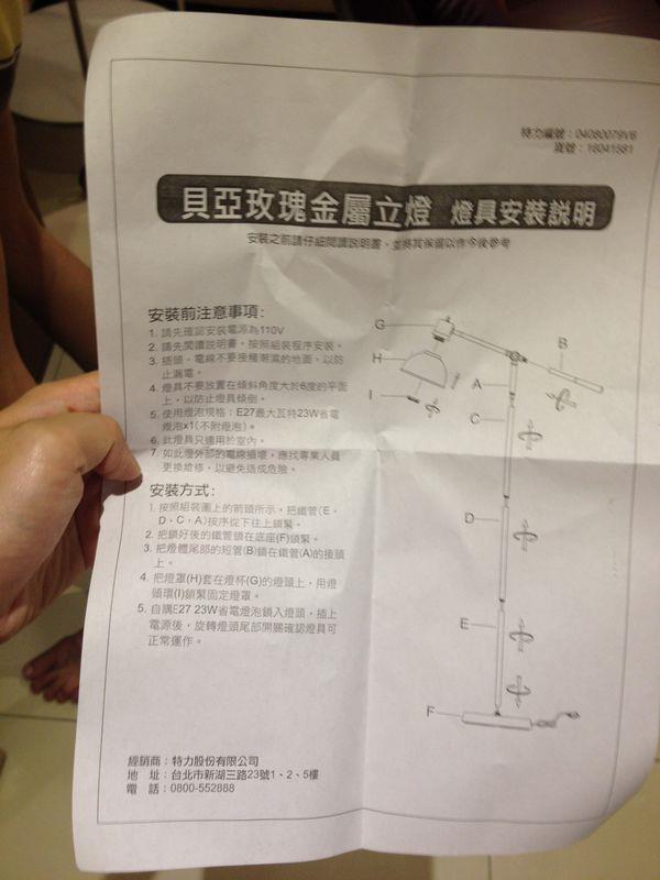 一直覺得客廳沙發牆那面有點空有天翻閱居家裝潢雜誌時才赫然發現原來就是少了一盞燈呀!! 哈哈哈~~發現這個驚人(?)的事實後,立馬上網查詢屬意的立燈圖片來源:特力屋網頁 看來看去,最屬意特力屋的這盞貝亞玫瑰金屬立燈造型簡潔又時尚,搭配玫瑰鍍金色的手把與轉頭整個正中紅心,沒想太多就下單啦!!包裏寄來的時候,層層密封,還加上了紙隔板防撞燈罩以及主體的部分也都用塑膠袋裝好,避免刮傷附上一張燈具安裝說明,不難安裝要注意的是確認安裝電源是110V的張大爺從開箱到組裝完成,不到五分鐘哩!!先將立燈主體依安裝說明書的步驟架起來後再把燈罩裝上,就大功告成啦這是燈罩內接燈泡的地方先把這個黑色的圓圈轉開,就可以將燈泡放入鎖緊了不過這個立燈是沒有附燈泡的所以我又另外加買了LED燈泡~LED節能環保電球(暖白)是節能環保電球喔這個立燈的燈泡規格是E27,最大不能超過23W(瓦)不然會有燈泡燒掉的危險可是我眼睛太大了啦!! 我以為我買的是10W結果收到後才發現我訂成1W的~~ 先勉強湊和著用哈,1W的燈泡好小一個下次採買的時候再換成10W的燈罩內部就有貼上規格E27 MAX 23W CFLE27就是規格,MAX 23W,就是最大不能超過23W燈燈,組裝完成,點燈!!!白色與玫瑰金的搭配,真的很有質感~不管擺在家裡的什麼空間都很適合這個旋轉軸可以調整光源角度開關在燈座上方沙發的內側是我的專屬閱讀書(看小說漫畫等閒書)我喜歡在夜深人靜,小孩都入睡的時候將客廳的燈弄成間接燈光再點上這盞立燈捧著書或iPad,喝點氣泡水或是薄酒整天的疲勞都可以溶化在這個微醺的氣氛裡是製造情境的好幫手!!小孩子們未來我會給他們每人一張書桌在各自的房間裡不過在小的時候為了方便"控管"只要有適當光源,餐桌又可以變身成大書桌兄妹兩人一起畫畫、玩玩具、做勞作都很適合本來的餐桌上只有一盞小燈妹妹的位置常常會有光線死角現在只要小孩要一起學習的時候,可以把貝亞玫瑰金屬立燈移到餐桌增加光源後就不怕小孩近視了把立燈放在張大爺的主人椅跟沙發中間也很好看這樣移到餐桌也方便!~ 有了這盞立燈後,有沒有覺得整個客廳多了一點人文氣息了呢?哪裡買?特力屋:http://www.i-house.com.tw/product/detail/id/525097推薦代碼請填:bookwormgirl (微薄獎金全數捐獻公益團體)