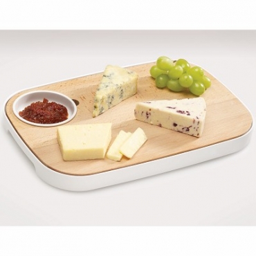 木質兩用砧板 雙面可使用,具有多用途設計 麵包面板邊緣設計碎屑溝槽 平整的起士切割面板 移動的調味料盤,可放置牛油、油或醋 附有止滑點與提把的托盤